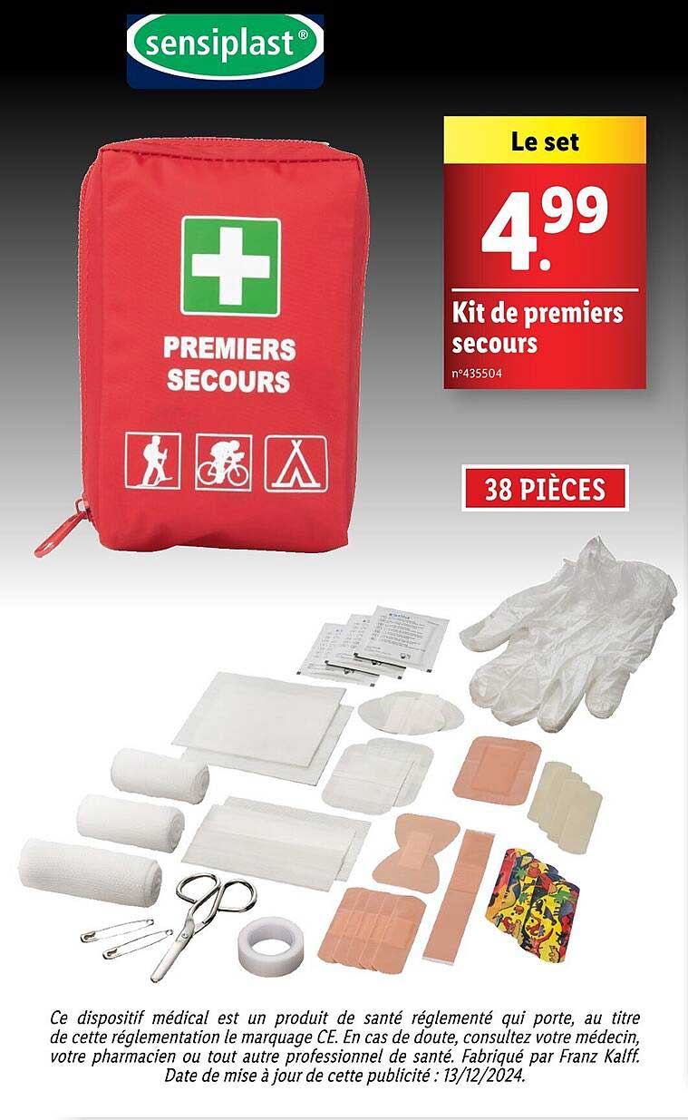 Découvrez dès maintenant la offre Kit de premiers secours dans le catalogue de Lidl. Cette offre est valable du 02/01/2025 au 06/01/2025.