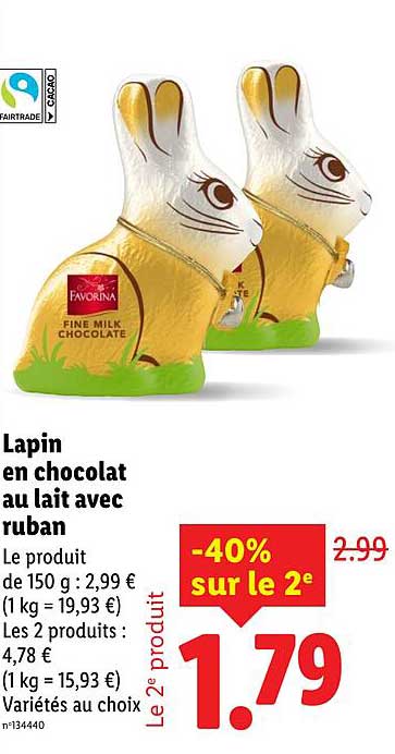 Profitez d'une réduction incroyable de 40% sur le deuxième produit. Le prix initial est de 2,99 €, mais grâce à cette offre, il ne vous en coûtera que 1,79 € pour le deuxième lapin, ramenant le total à 4,78 € pour deux. C'est une occasion en or pour faire le plein de chocolat sans se ruiner !