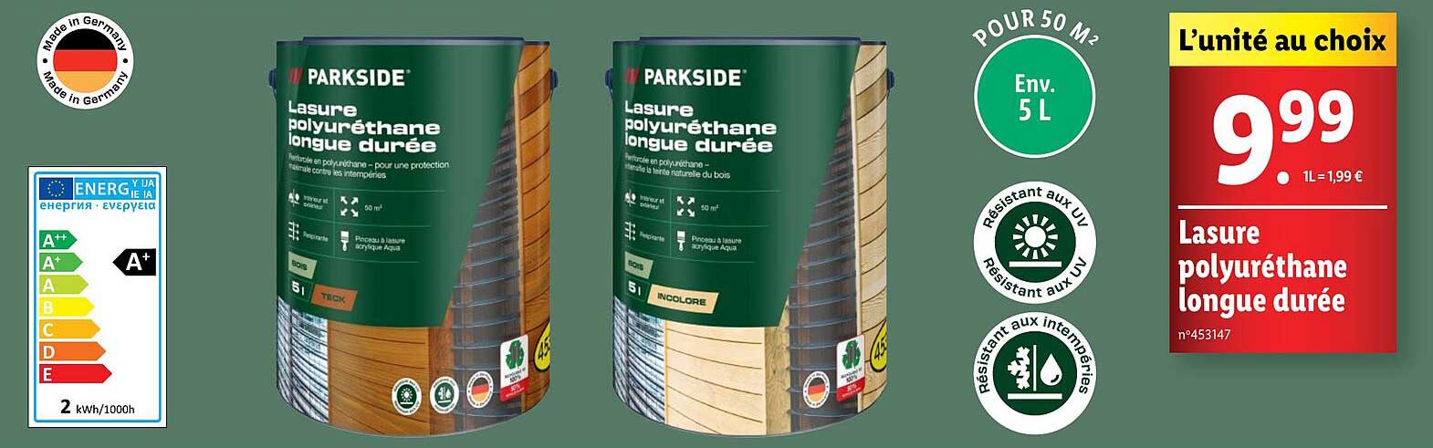 Découvrez la superbe offre de Lasure Polyuréthane Longue Durée dans le nouveau catalogue de Lidl. En plus de cette offre, vous trouverez de nombreuses autres réductions attrayantes. Vous pouvez facilement commander le Lasure Polyuréthane Longue Durée en ligne via le site web de Lidl ou l'acheter dans un magasin près de chez vous.