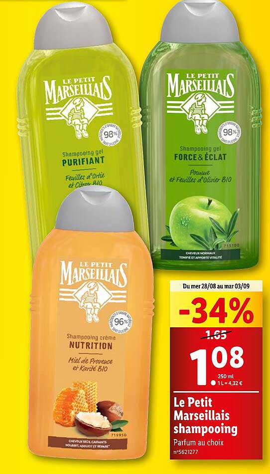 Découvrez dès maintenant la offre Le Petit Marseillais shampoing dans le catalogue de Lidl. Cette offre est valable du 28/08/2024 au 03/09/2024.