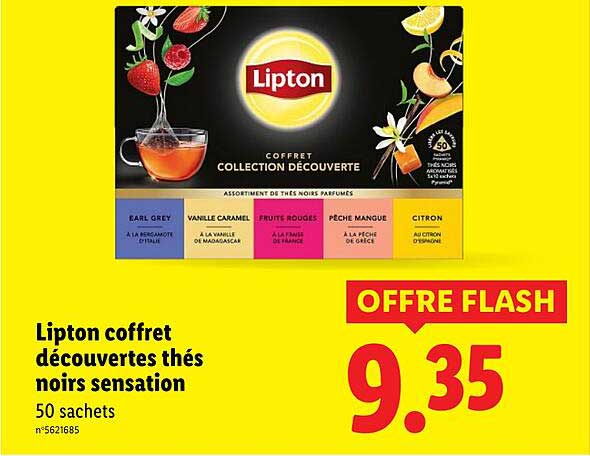 Découvrez dès maintenant la offre Lipton coffret découvertes thés noirs sensation dans le catalogue de Lidl. Cette offre est valable du 20/02/2025 au 26/02/2025.