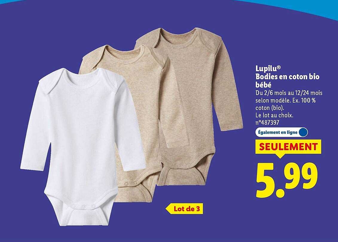 Découvrez une offre exceptionnelle sur les bodys en coton bio bébé de la marque Lupilu®. Spécialement conçus pour le confort de votre petit, ces bodys sont Non seulement pratiques, mais aussi respectueux de la peau délicate des nourrissons. Profitez de cette occasion pour fournir à votre enfant des vêtements de qualité tout en réalisant des économies.