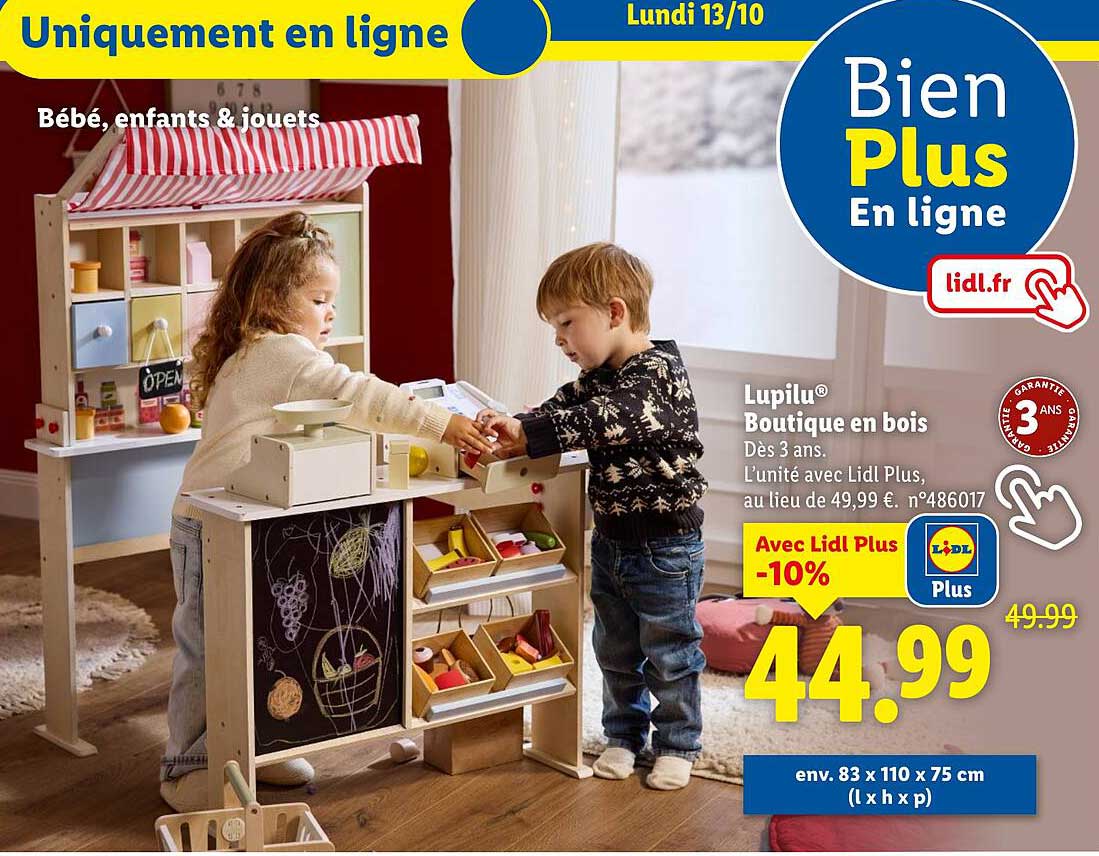 Découvrez dès maintenant la offre Lupilu® Boutique en bois dans le catalogue de Lidl. Cette offre est valable du 13/10/2025 au 16/10/2025.