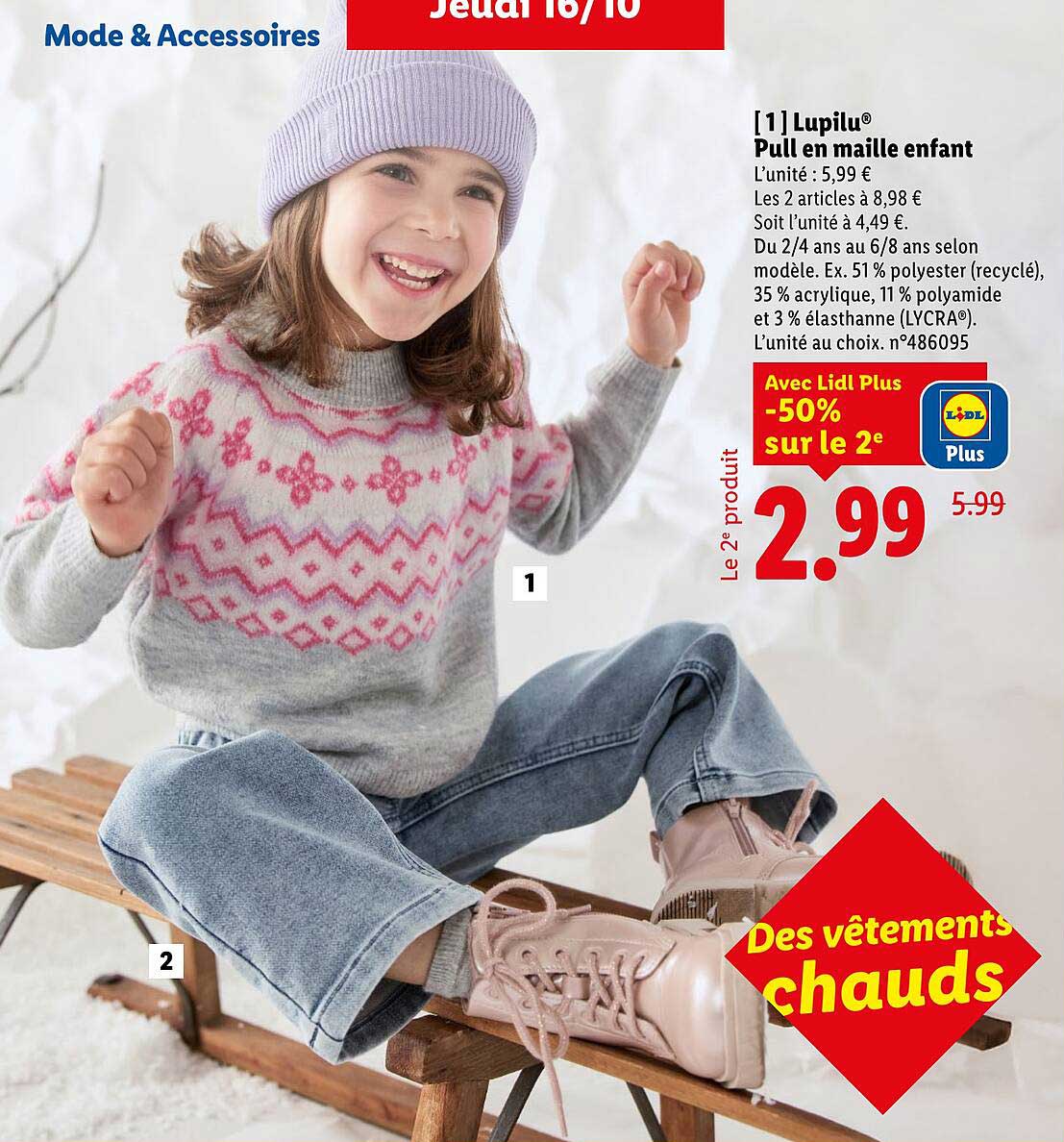 Le prix habituel de ce pull est de 5,99 €. Cependant, pendant cette période de promotion, vous pouvez bénéficier d'une réduction de 50% sur le deuxième article. Ainsi, si vous achetez deux pulls, le prix du deuxième ne sera que de 2,99 €. Une excellente occasion d’équiper vos enfants pour l’hiver à petit prix !