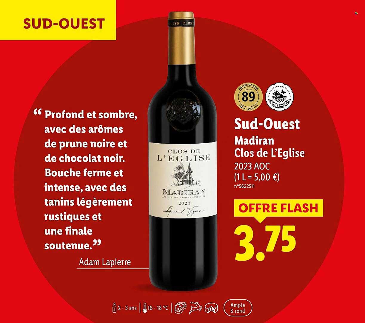 Découvrez dès maintenant la offre Madirans Clos de L'Eglise 2023 AOC dans le catalogue de Lidl. Cette offre est valable du 04/09/2025 au 10/09/2025.