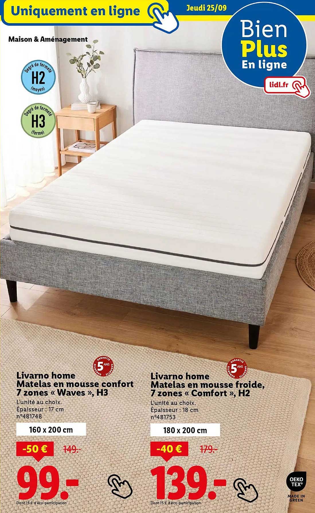 Découvrez dès maintenant la offre Matelas en mousse confort 7 zones « Waves », H3 dans le catalogue de Lidl. Cette offre est valable du 22/09/2025 au 25/09/2025.