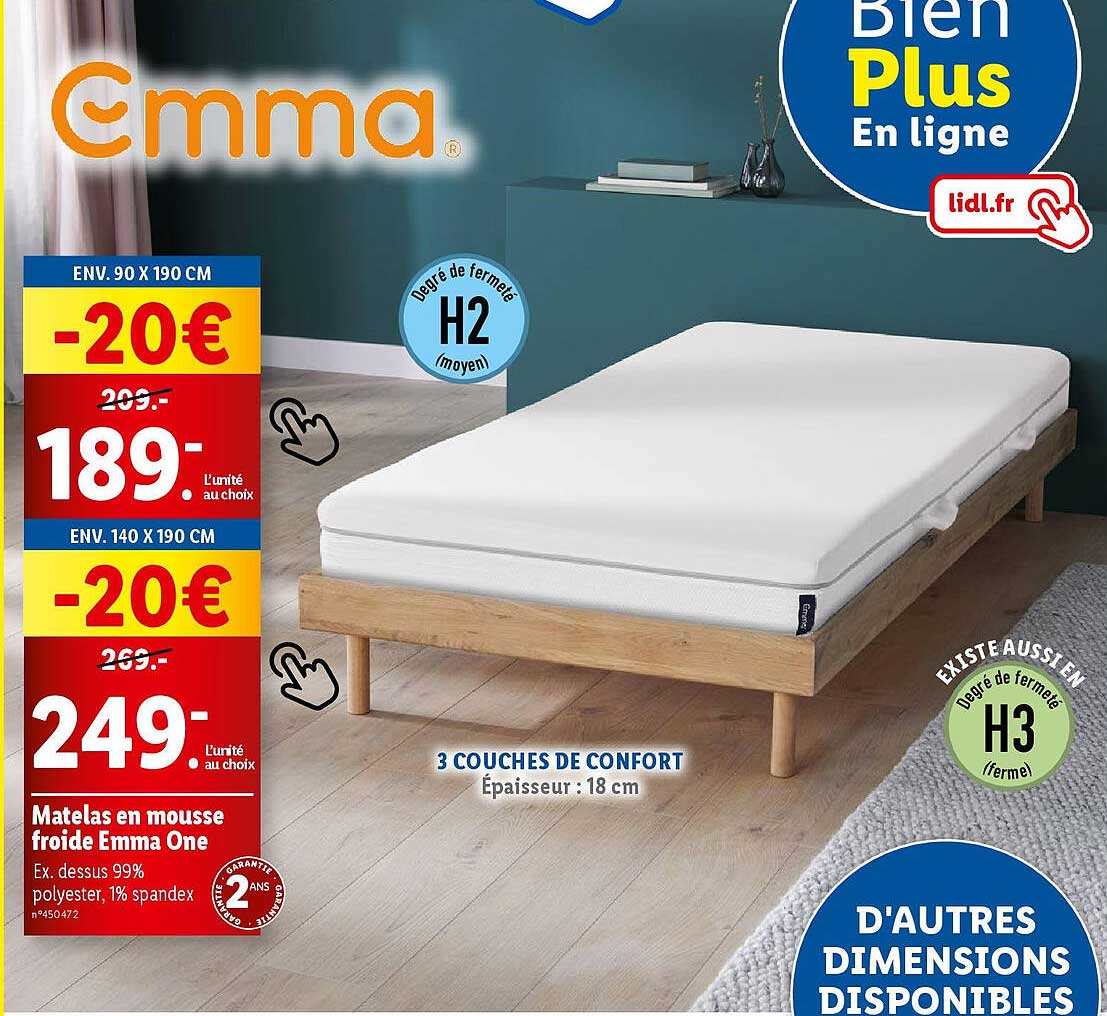 Découvrez dès maintenant la offre Matelas en mousse froide Emma One dans le catalogue de Lidl. Cette offre est valable du 24/09/2024 au 28/09/2024.