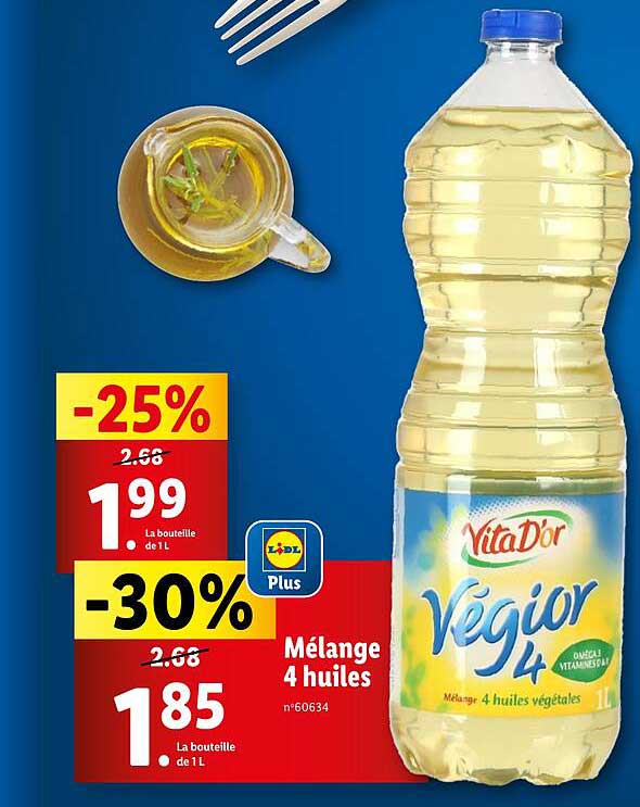 Découvrez l'offre de Mélange 4 Huiles chez Lidl! Cette offre fantastique est maintenant disponible dans le nouveau catalogue de Lidl. Profitez de cette occasion et économisez considérablement sur votre achat.