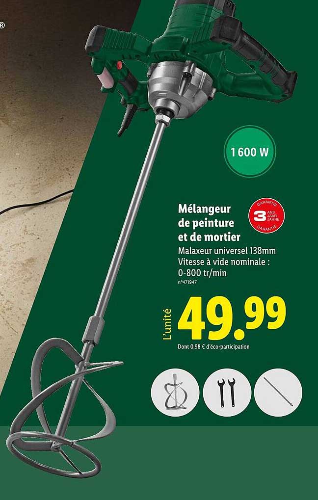 Vous êtes passionné par les travaux manuels ou les projets de rénovation ? Ne cherchez plus ! Lidl vous propose un mélangeur de peinture et de mortier à un prix imbattable. Ce produit vous aidera à réaliser des mélanges homogènes et efficaces pour toutes vos préparations, que ce soit pour vos travaux de peinture ou pour la création de mortier pour vos petits bricolages.