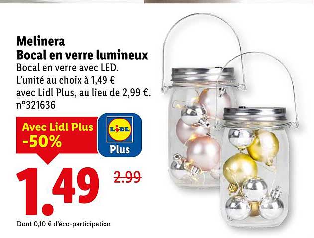 Vous cherchez à ajouter une touche lumineuse et festive à votre décor ? Ne cherchez plus ! Le bocal en verre lumineux Melinera est l'élément parfait pour illuminer votre intérieur. Disponibles à partir de 1,49 € avec Lidl Plus, ces bocaux sont à un prix exceptionnel, surtout si l'on considère qu'ils étaient auparavant à 2,99 €. Une belle affaire à ne pas rater !