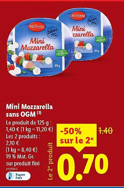 Actuellement, le prix de cette mozzarella est de 1,40 €, mais avec l'offre exceptionnelle, vous bénéficiez de -50% sur le deuxième produit, ce qui vous permet de l'obtenir à seulement 0,70 €. Une excellente opportunité pour faire des économies tout en vous régalant !