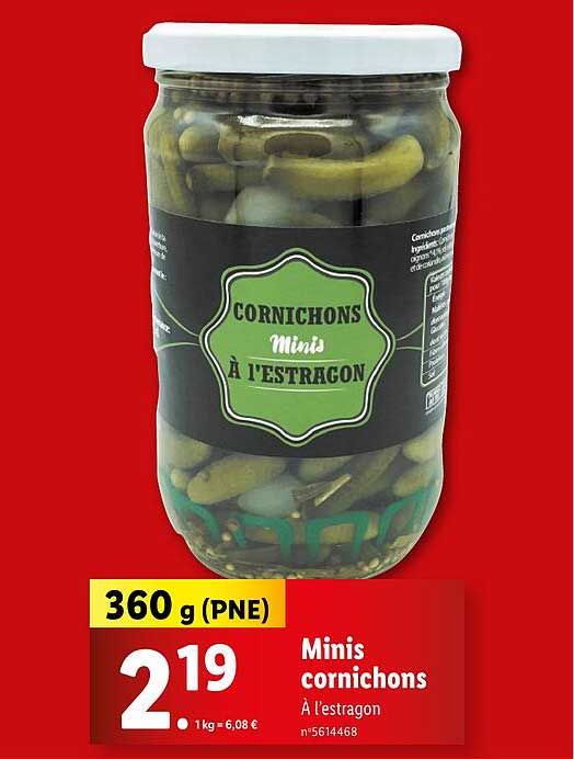 Découvrez l'offre de Minis Cornichons À L'estragon chez Lidl! Cette offre fantastique est maintenant disponible dans le nouveau catalogue de Lidl. Profitez de cette occasion et économisez considérablement sur votre achat.