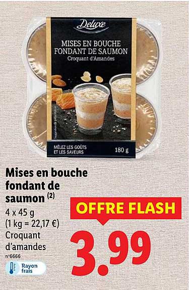 Ne manquez pas cette surprenante offre flash de Lidl sur les mises en bouche fondant de saumon ! À seulement 3,99 €, ce délice culinaire de 180 g est parfait pour vos apéritifs ou vos repas festifs. Imaginez vos invités émerveillés par ces petites bouchées savoureuses qui combinent le goût raffiné du saumon et le croquant des amandes.