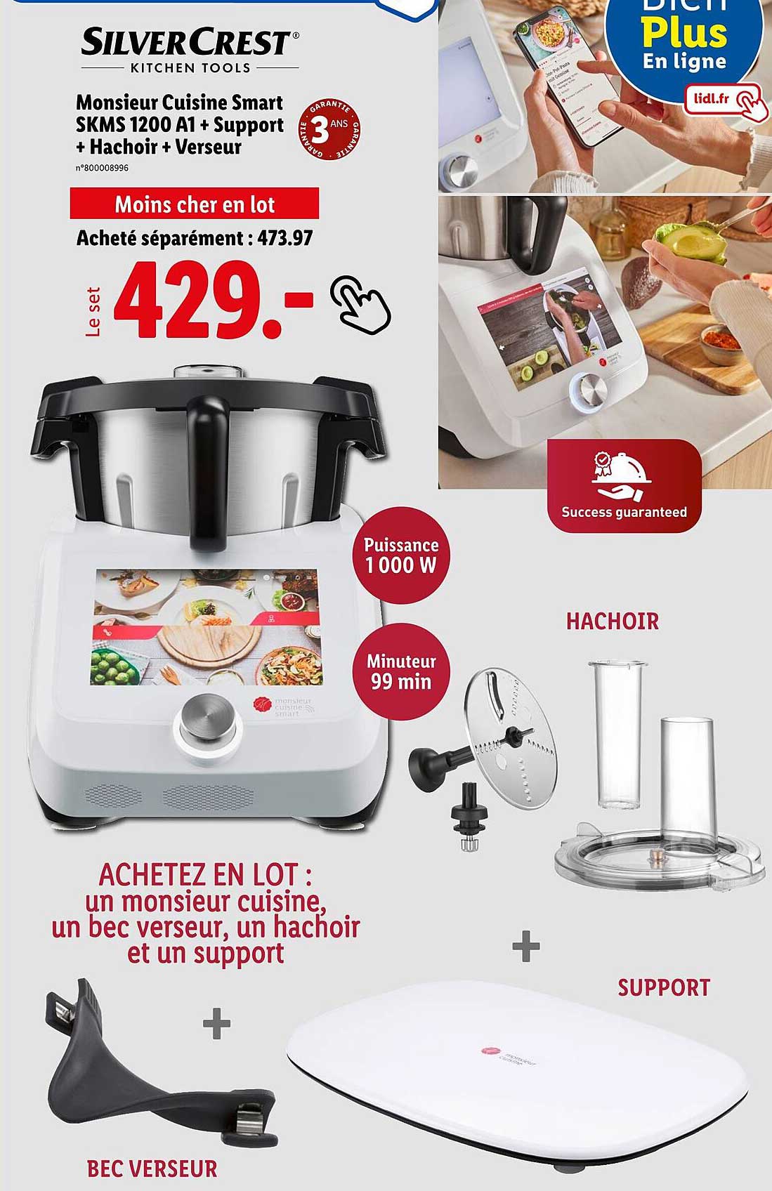 Découvrez dès maintenant la offre Monsieur Cuisine Smart SKMS 1200 A1 + Support + Hachoir + Verseur dans le catalogue de Lidl. Cette offre est valable du 14/04/2025 au 17/04/2025.