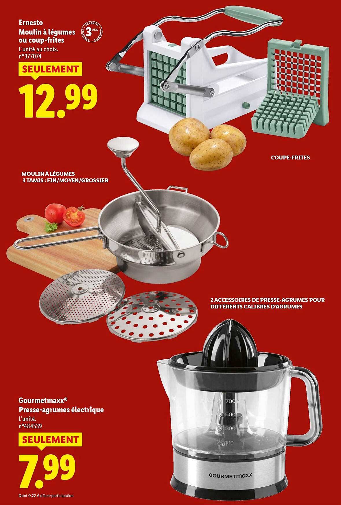 Découvrez le Moulin à légumes ou coup-frites de la marque Ernesto, un outil indispensable pour préparer vos plats préférés. Que ce soit pour réaliser des frites croustillantes ou pour préparer des purées onctueuses, cet appareil vous simplifie la vie en cuisine. Avec une promotion exclusive pendant quelques jours seulement, c’est l’occasion rêvée de l’adopter dans votre quotidien !