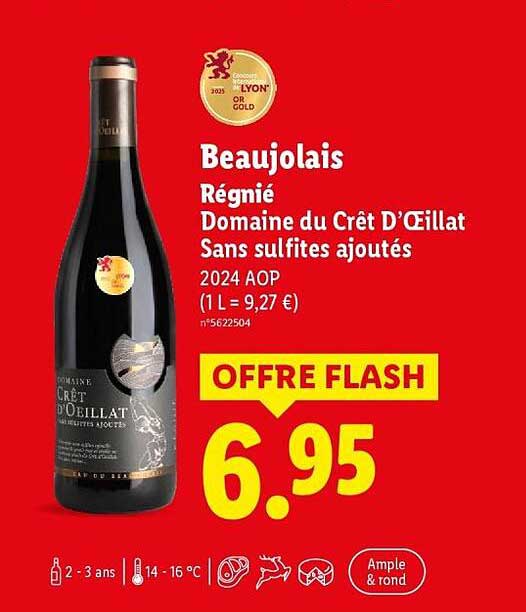 Découvrez une offre exceptionnelle sur le Beaujolais Régnié du Domaine du Crêt D'Oëillat. Ce vin, certifié sans sulfites ajoutés, est idéal pour ceux qui recherchent une expérience authentique et naturelle. Avec son prix attractif, c'est l'occasion rêvée d'explorer des saveurs riches et généreuses à chaque gorgée.