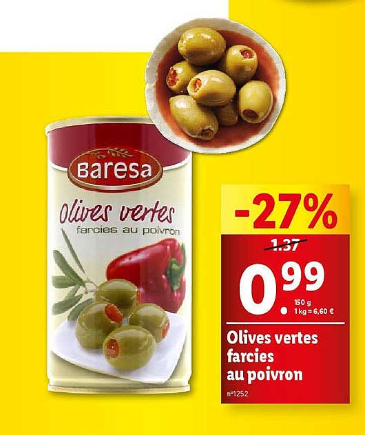 Découvrez l'offre de Olives Vertes Farcies Au Poivron chez Lidl! Cette offre fantastique est maintenant disponible dans le nouveau catalogue de Lidl. Profitez de cette occasion et économisez considérablement sur votre achat.