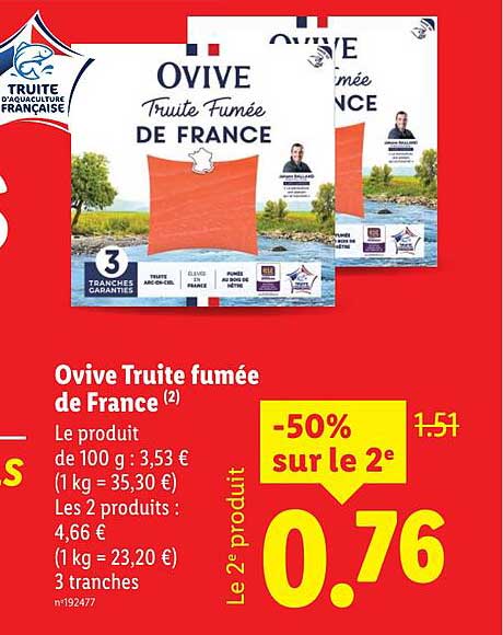 Le prix habituel de la truite fumée est de 1,51 € par paquet, mais grâce à cette offre, vous bénéficiez de -50% sur le deuxième produit. Cela signifie que vous pouvez réaliser des économies substantielles : 0,76 € pour le deuxième paquet, un prix qui n'est pas à négliger pour un produit aussi gourmet.