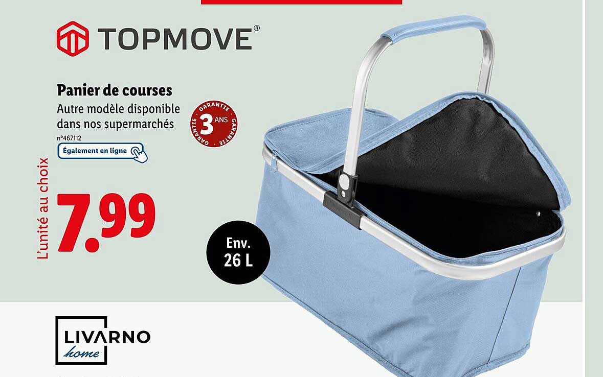 Découvrez le panier de courses TOPMOVE, l'accessoire idéal pour faciliter vos sorties shopping. Avec sa capacité d'environ 26 litres, ce panier est parfait pour transporter vos courses en toute simplicité et avec style. Profitez de cette offre exceptionnelle valable du 21 au 24 juillet 2025, une occasion à ne pas manquer pour vous équiper à petit prix.