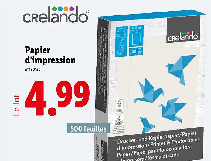 Vous êtes à la recherche de papier d'impression de qualité à un prix imbattable ? Ne cherchez plus ! Lidl propose une offre exceptionnelle sur le papier d'impression de la marque Crelando. Pour seulement 4,99 €, vous pouvez vous procurer un lot de 500 feuilles, parfait pour tous vos besoins d'impression, que ce soit pour des documents scolaires, des rapports professionnels ou des projets créatifs.