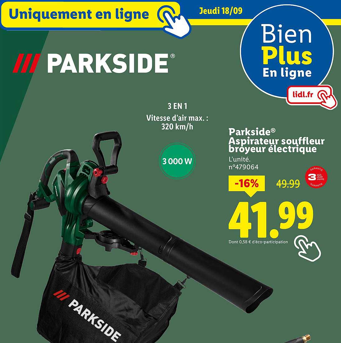 Découvrez l'aspirateur souffleur broyeur électrique Parkside®, un outil polyvalent qui révolutionnera vos travaux de jardinage ! Disponible uniquement entre le 18 et le 22 septembre 2025, cette offre exceptionnelle vous permet de profiter d'un produit de qualité à un prix imbattable.