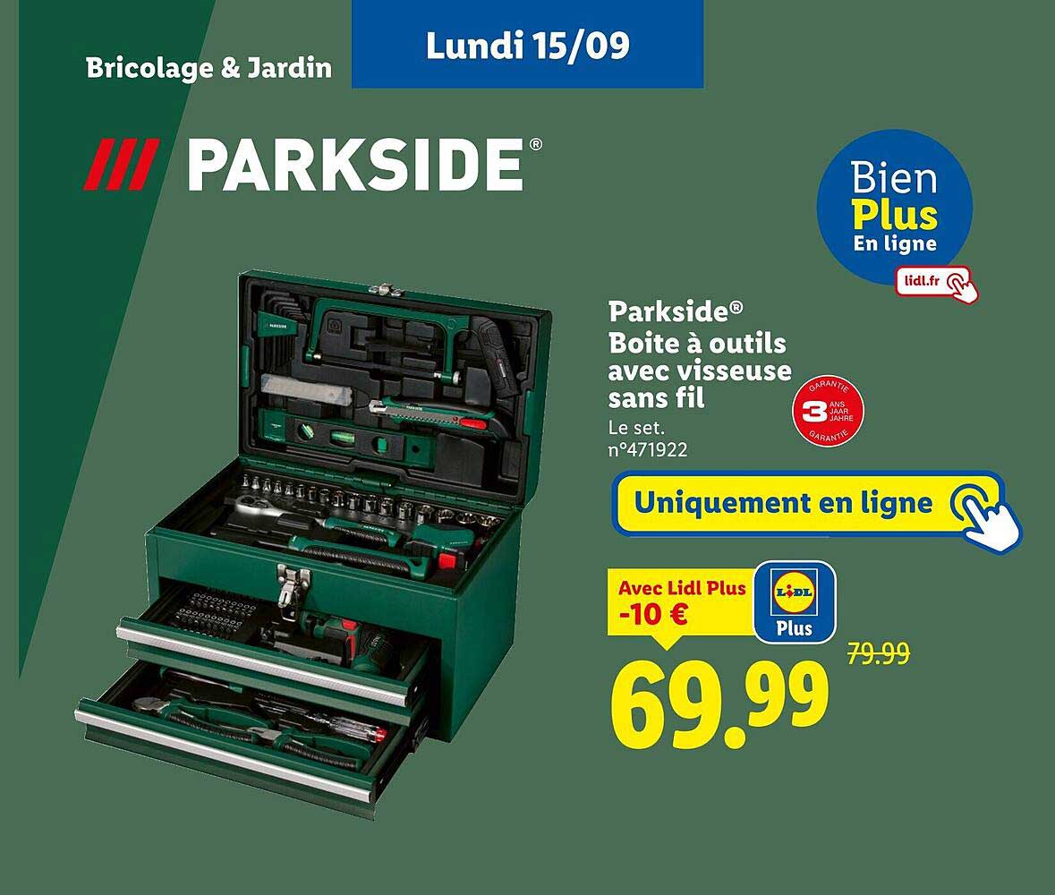 Découvrez dès maintenant la offre Parkside® Boite à outils avec visseuse sans fil dans le catalogue de Lidl. Cette offre est valable du 11/09/2025 au 15/09/2025.