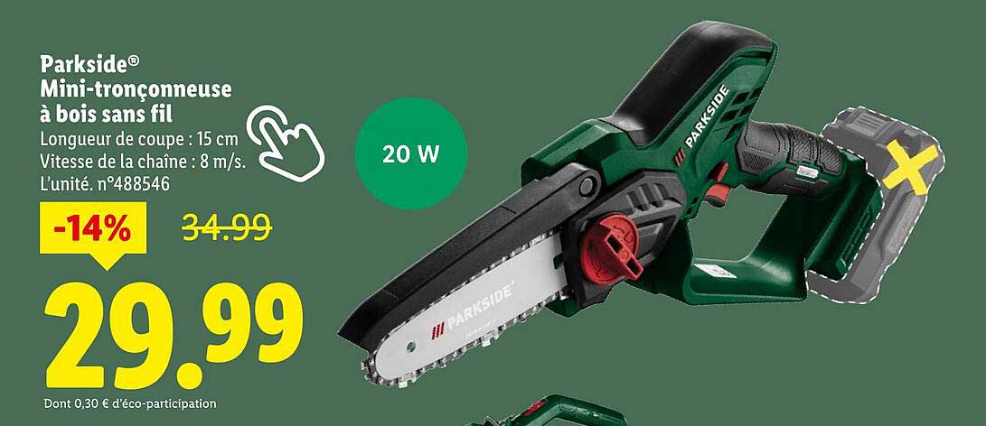 Découvrez dès maintenant la offre Parkside® Mini-tronçonneuse à bois sans fil dans le catalogue de Lidl. Cette offre est valable du 13/10/2025 au 16/10/2025.