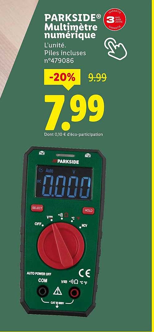 Le multimètre numérique PARKSIDE est l'outil indispensable pour tous vos projets de bricolage et travaux d'électronique. Doté d'une garantie de 3 ans, cet appareil vous assure fiabilité et précision. Actuellement proposé à seulement 7,99 €, soit 20% de réduction par rapport au prix habituel, il constitue une excellente affaire pour quiconque souhaite optimiser ses dépenses tout en investissant dans des équipements de qualité.