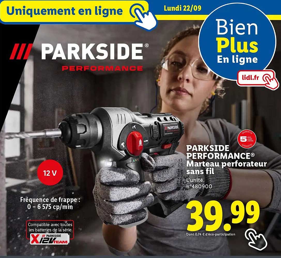 Découvrez dès maintenant la offre PARKSIDE PERFORMANCE® Marteau perforateur sans fil dans le catalogue de Lidl. Cette offre est valable du 22/09/2025 au 25/09/2025.