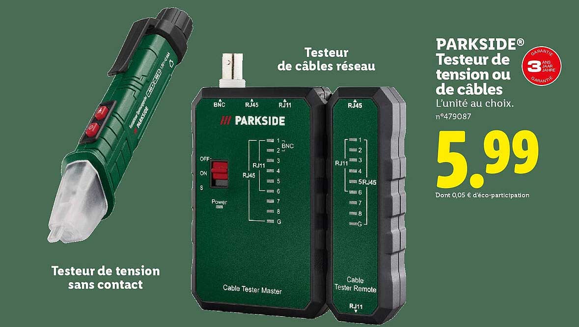 Découvrez le testeur de tension ou de câbles PARKSIDE, un outil indispensable pour les bricoleurs et les professionnels. Profitez de cette offre exceptionnelle sur cette page, valable du 2025-09-03 au 2025-09-08. Que vous soyez en train de vérifier l'état de vos câbles électriques ou de tester des connexions réseau, ce produit s'avère être une excellente affaire.