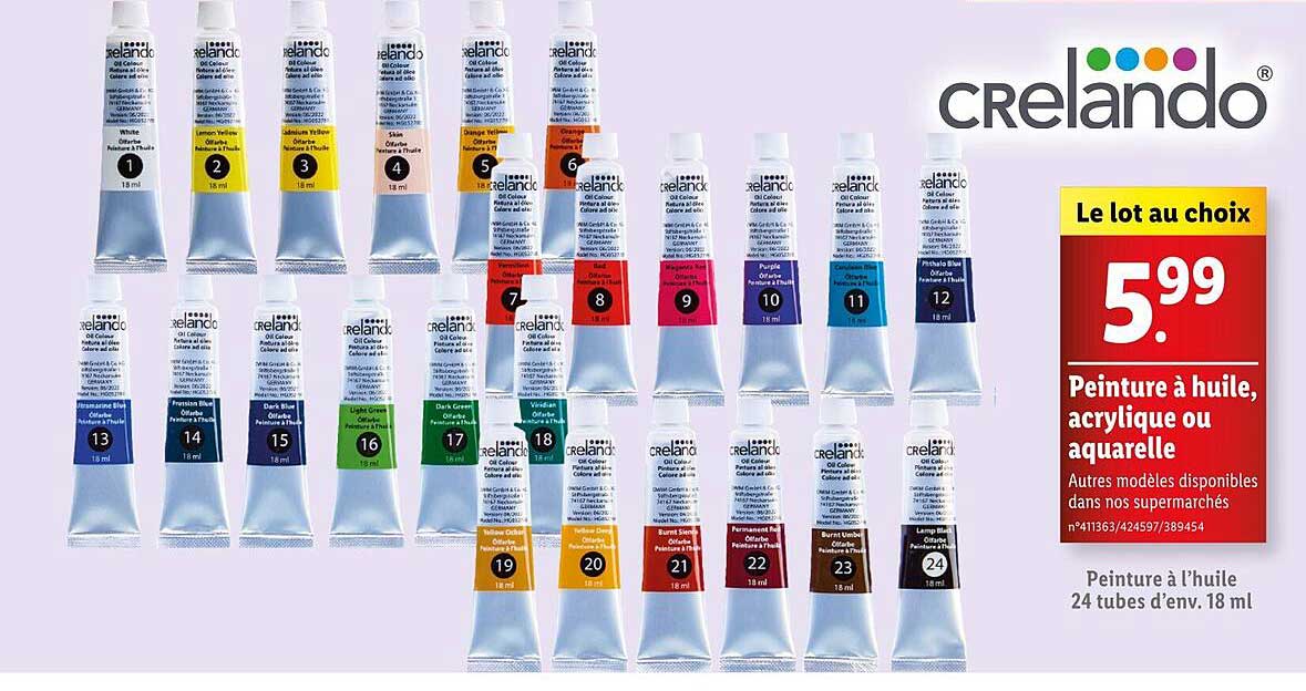 Découvrez dès maintenant la offre Peinture à huile, acrylique ou aquarelle dans le catalogue de Lidl. Cette offre est valable du 30/01/2025 au 03/02/2025.