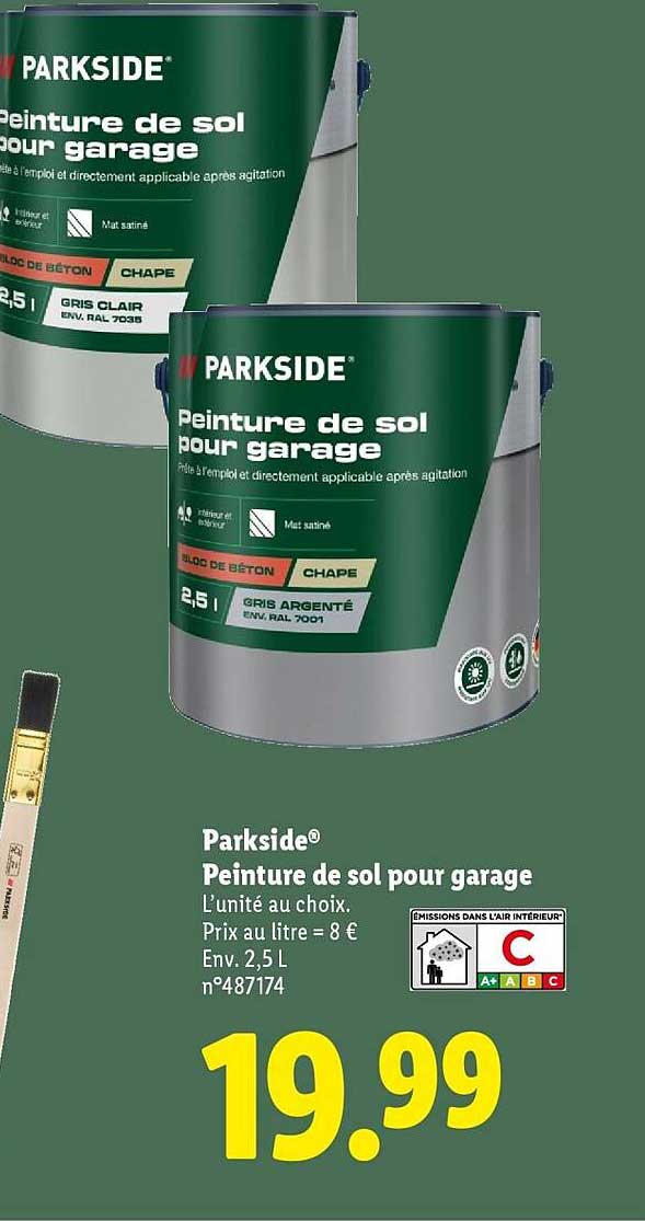 Découvrez une excellent promotion sur la peinture de sol pour garage Parkside. Parfaite pour redonner un coup de neuf à votre garage, cette peinture est spécialement conçue pour être appliquée directement dans les espaces exigus. Que vous souhaitiez protéger votre sol contre les taches ou simplement lui donner un aspect esthétique, cette offre est à ne pas manquer.