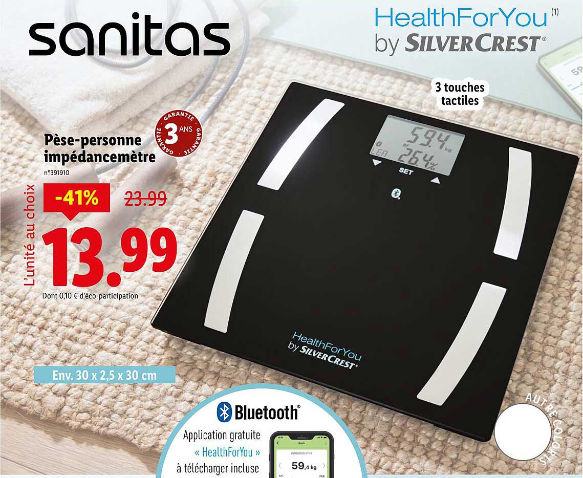 Cette semaine, Lidl vous propose une offre irrésistible avec le pèse-personne impédancemètre Sanitas. Conçu pour vous accompagner dans votre quête de bien-être, cet appareil vous aide à suivre votre poids et votre masse graisseuse de manière précise et fiable.