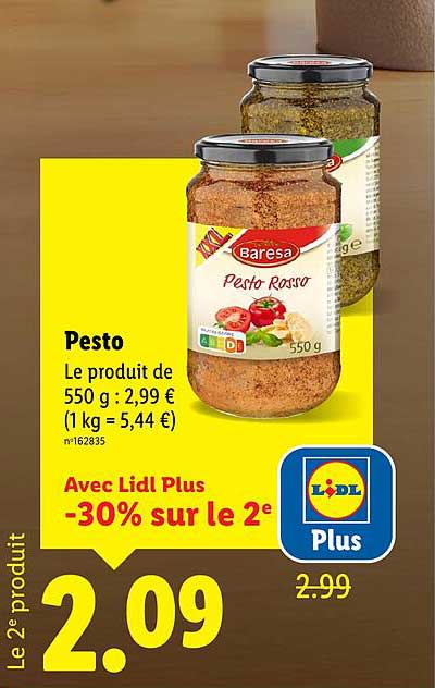 Actuellement, le pesto est proposé à 2,99 €, mais grâce à notre offre spéciale, vous pourrez bénéficier d'un prix réduit à 2,09 € pour le deuxième pot avec Lidl Plus. Cette économie de 30 % sur le deuxième produit fait de cette offre une occasion à ne pas manquer!