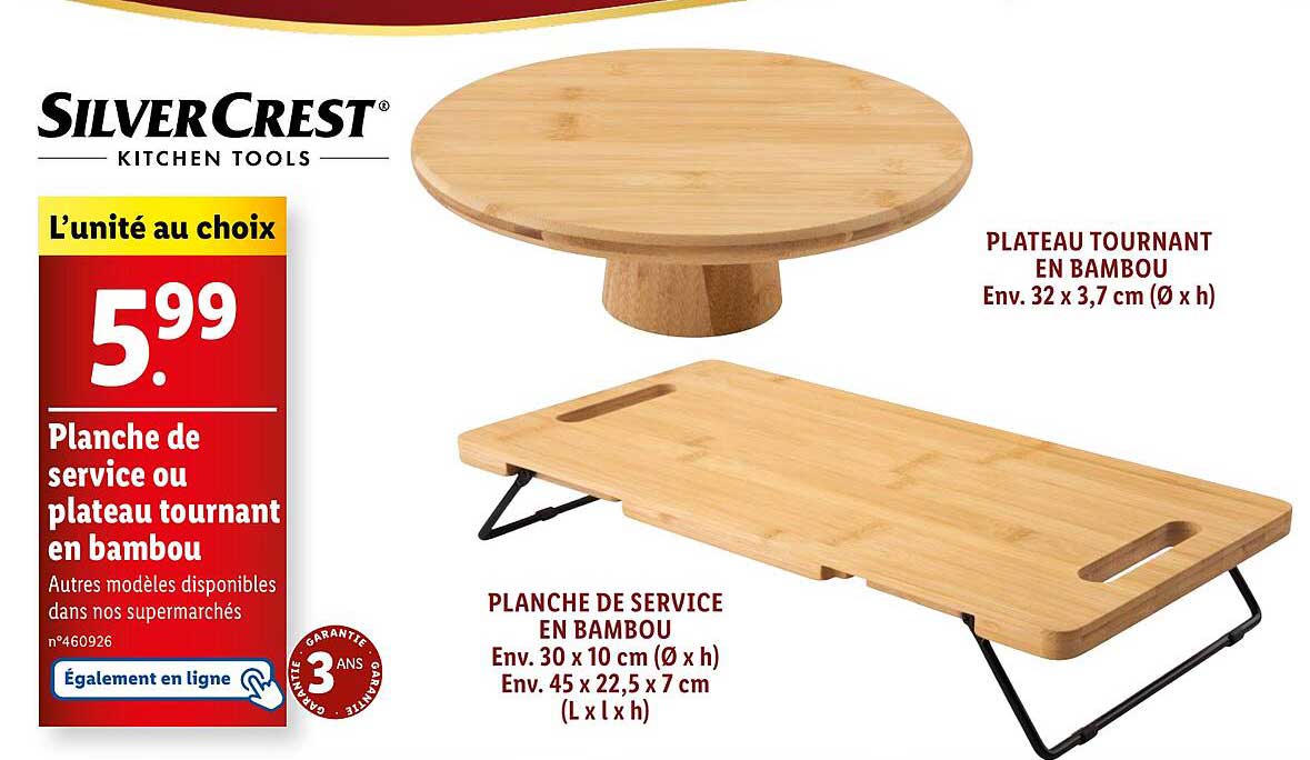 Découvrez l'offre de Planche De Service Ou Plateau Tournant En Bambou chez Lidl! Cette offre fantastique est maintenant disponible dans le nouveau catalogue de Lidl. Profitez de cette occasion et économisez considérablement sur votre achat.