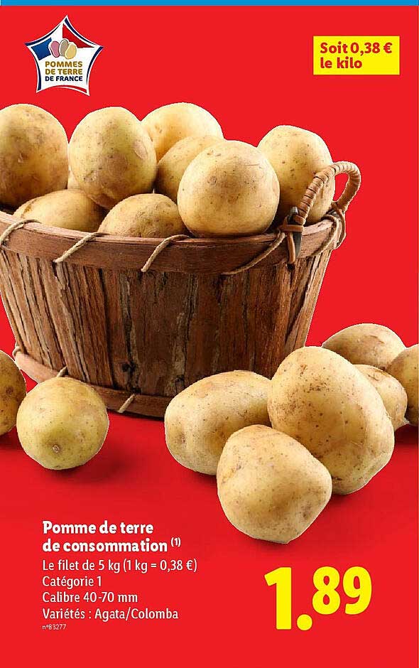 Ne manquez pas cette excellente occasion de vous procurer des pommes de terre de consommation ! Disponibles en format de 5 kg, ces pommes sont idéales pour toutes vos préparations culinaires, que ce soit pour des frites croustillantes, des purées savoureuses ou des gratins délicieux. Avec un prix exceptionnel de seulement 1,89 € pour un filet de 5 kg, c'est le moment parfait pour faire le plein de ce produit essentiel.
