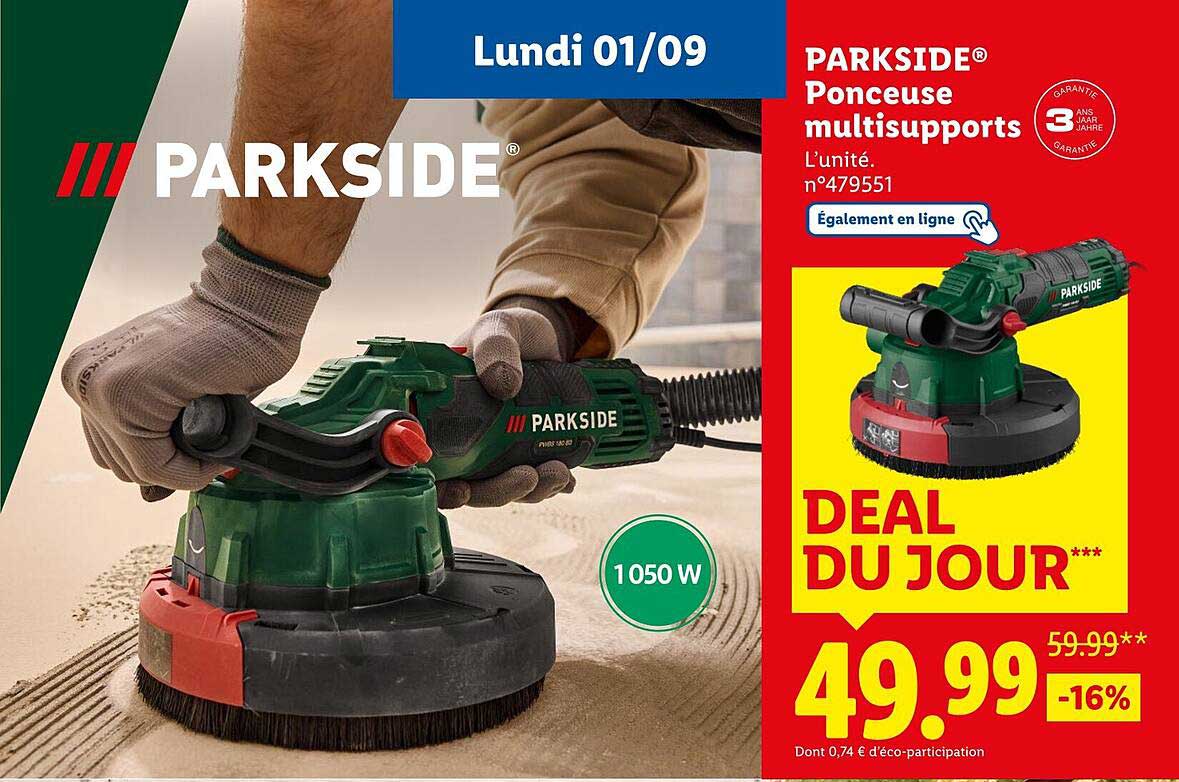 La ponceuse multisupports PARKSIDE est l'outil idéal pour tous vos travaux de bricolage ! Avec sa puissance de 1050 W, elle vous permet d'obtenir des surfaces parfaitement lisses, que ce soit pour des projets de rénovation ou d'aménagement intérieur. Profitez de cette super offre valable du 1er au 4 septembre 2025.