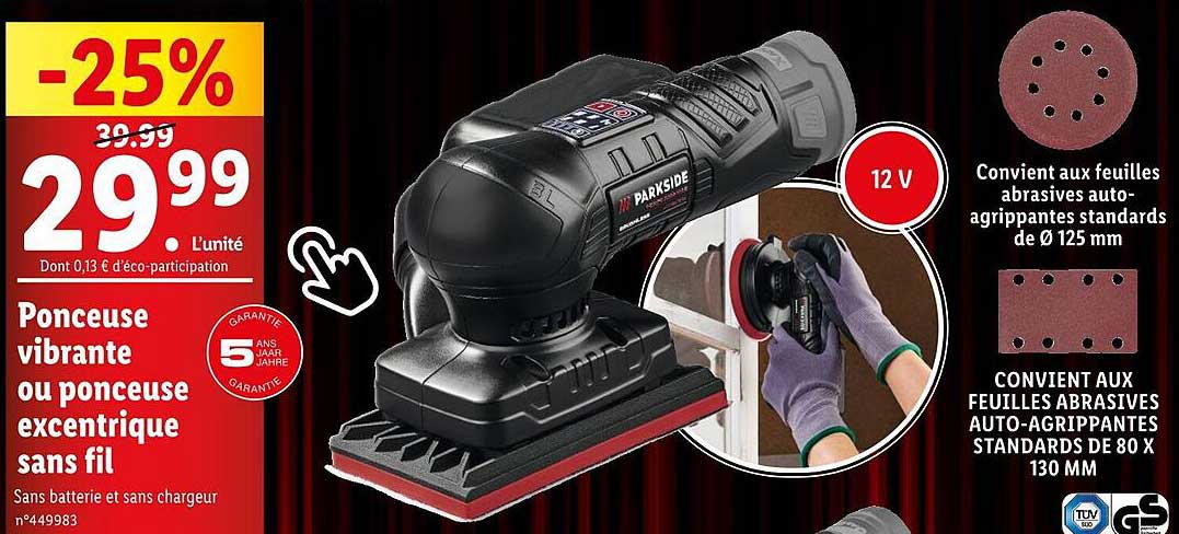 Découvrez l'offre de Ponceuse Vibrante Ou Ponceuse Excentrique Sans Fil chez Lidl! Cette offre fantastique est maintenant disponible dans le nouveau catalogue de Lidl. Profitez de cette occasion et économisez considérablement sur votre achat.