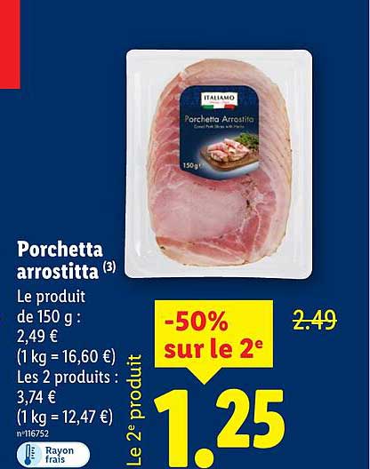 La Porchetta arrostitta est actuellement proposée au prix de 2,49 €, représentant un excellent rapport qualité-prix. Et ce n'est pas tout ! Profitez de l'offre exceptionnelle avec 50% de réduction sur le deuxième produit, ce qui le fait passer à seulement 1,25 € pour le second article. C'est l'opportunité parfaite pour faire le plein sans se ruiner.