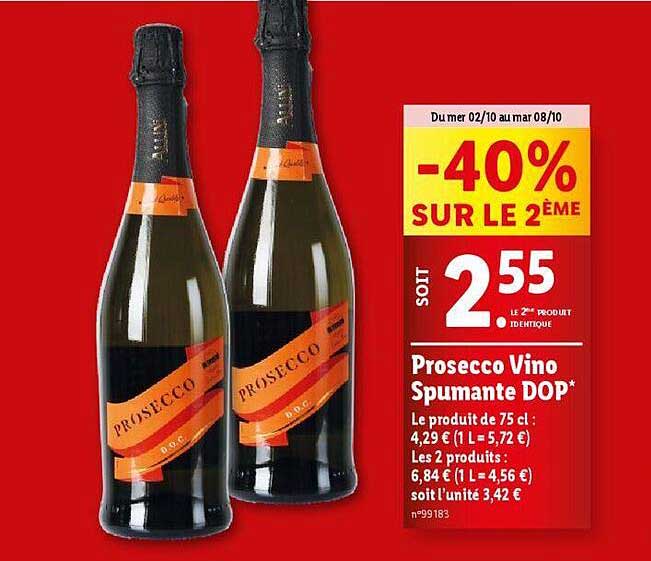 Découvrez dès maintenant la offre Prosecco Vino Spumante DOP* dans le catalogue de Lidl. Cette offre est valable du 02/10/2024 au 08/10/2024.