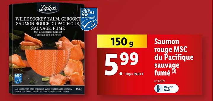 Découvrez dès maintenant la offre Saumon rouge MSC du Pacifique sauvage fumé dans le catalogue de Lidl. Cette offre est valable du 26/12/2024 au 31/12/2024.