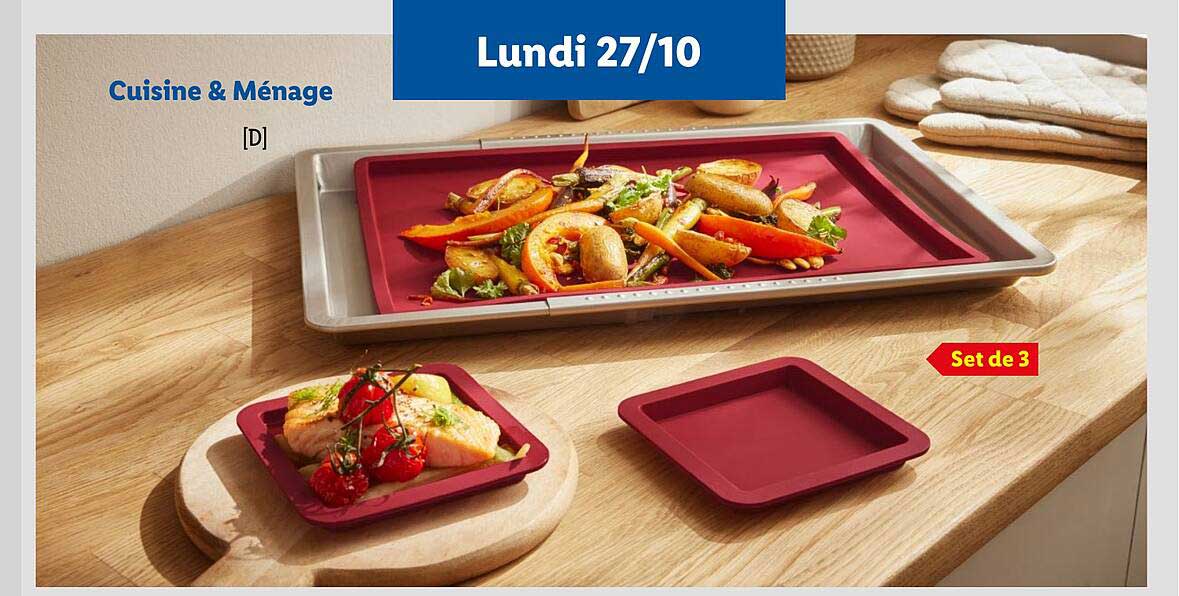 Découvrez le set de 3 plats en silicone, une offre incontournable chez Lidl ! Parfaits pour préparer, cuire ou servir vos plats préférés, ces ustensiles de cuisine allient praticité et esthétisme. Idéaux pour tous ceux qui aiment cuisiner avec style tout en profitant d'un excellent rapport qualité-prix.