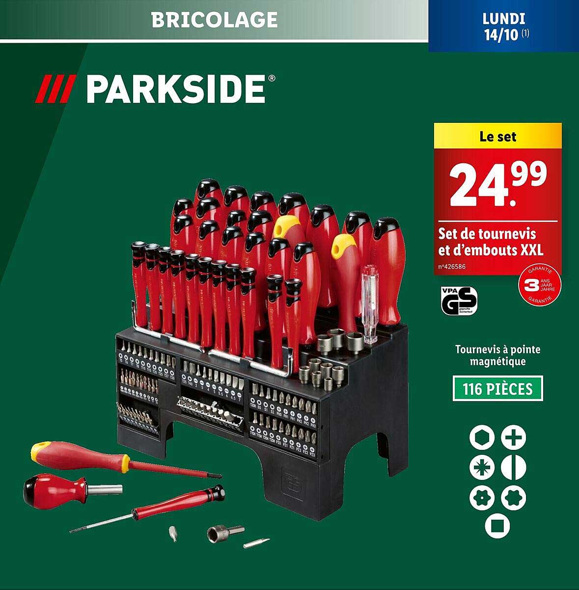 Découvrez dès maintenant la offre Set de tournevis et d'embouts XXL dans le catalogue de Lidl. Cette offre est valable du 14/10/2024 au 17/10/2024.