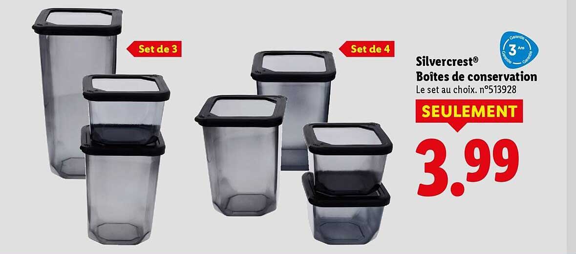 Découvrez les incroyables boîtes de conservation Silvercrest, disponibles en sets de 3 et 4, qui répondent à tous vos besoins de rangement. Que ce soit pour conserver vos aliments ou organiser votre cuisine, ces boîtes allient fonctionnalité et esthétisme. Profitez de cette offre exceptionnelle à un prix imbattable !