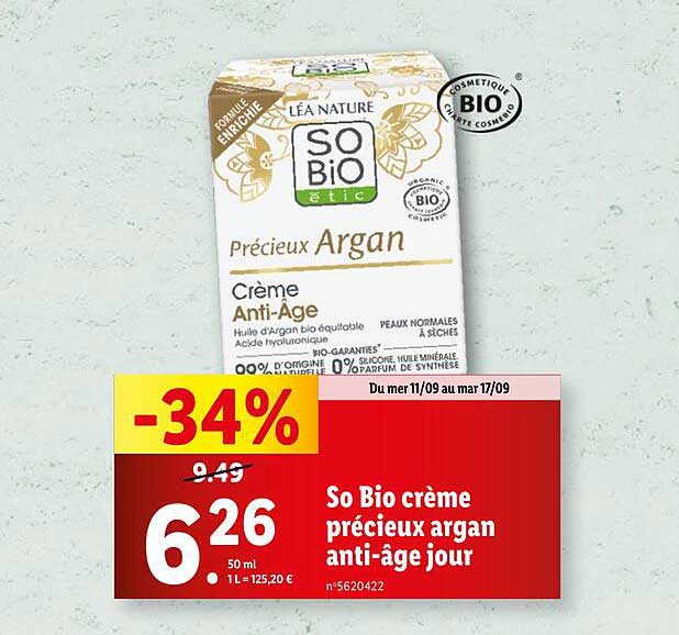 Découvrez dès maintenant la offre So Bio crème précieux argan anti-âge jour dans le catalogue de Lidl. Cette offre est valable du 11/09/2024 au 17/09/2024.