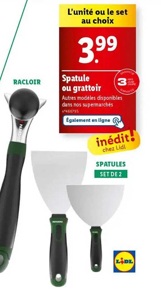 Découvrez l'offre de Spatule Ou Grattoir chez Lidl! Cette offre fantastique est maintenant disponible dans le nouveau catalogue de Lidl. Profitez de cette occasion et économisez considérablement sur votre achat.