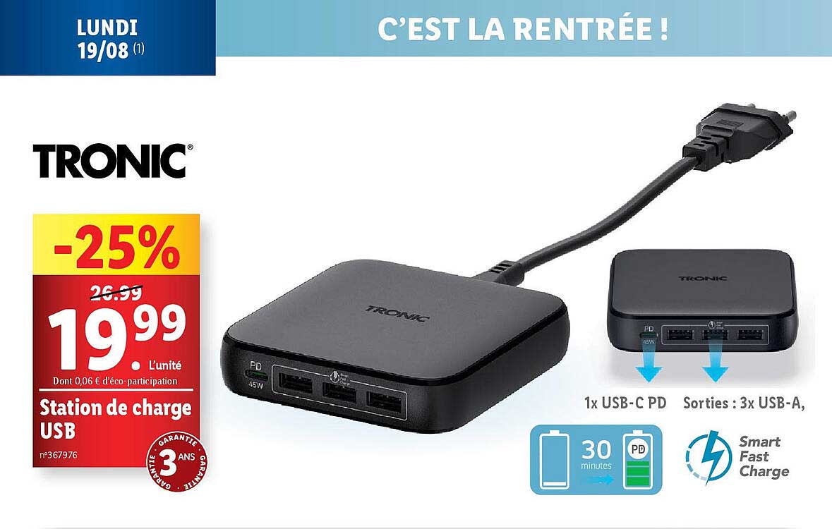 Découvrez l'offre de Station De Charge Usb chez Lidl! Cette offre fantastique est maintenant disponible dans le nouveau catalogue de Lidl. Profitez de cette occasion et économisez considérablement sur votre achat.