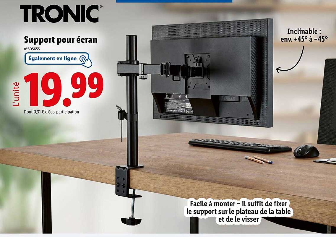Découvrez notre offre incroyable sur le support pour écran de la marque TRONIC, disponible chez Lidl du 14 au 17 juillet 2025. Ce support est la solution idéale pour optimiser votre espace de travail tout en garantissant un confort visuel optimal. Avec un prix attractif, ne manquez pas cette occasion de dynamiser votre coin bureau.