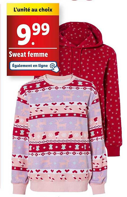 Découvrez la superbe offre de Sweat Femme dans le nouveau catalogue de Lidl. En plus de cette offre, vous trouverez de nombreuses autres réductions attrayantes. Vous pouvez facilement commander le Sweat Femme en ligne via le site web de Lidl ou l'acheter dans un magasin près de chez vous.