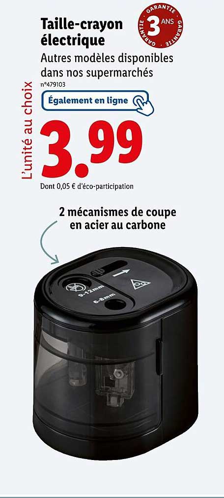 Découvrez dès maintenant la offre Taille-crayon électrique dans le catalogue de Lidl. Cette offre est valable du 10/07/2025 au 14/07/2025.